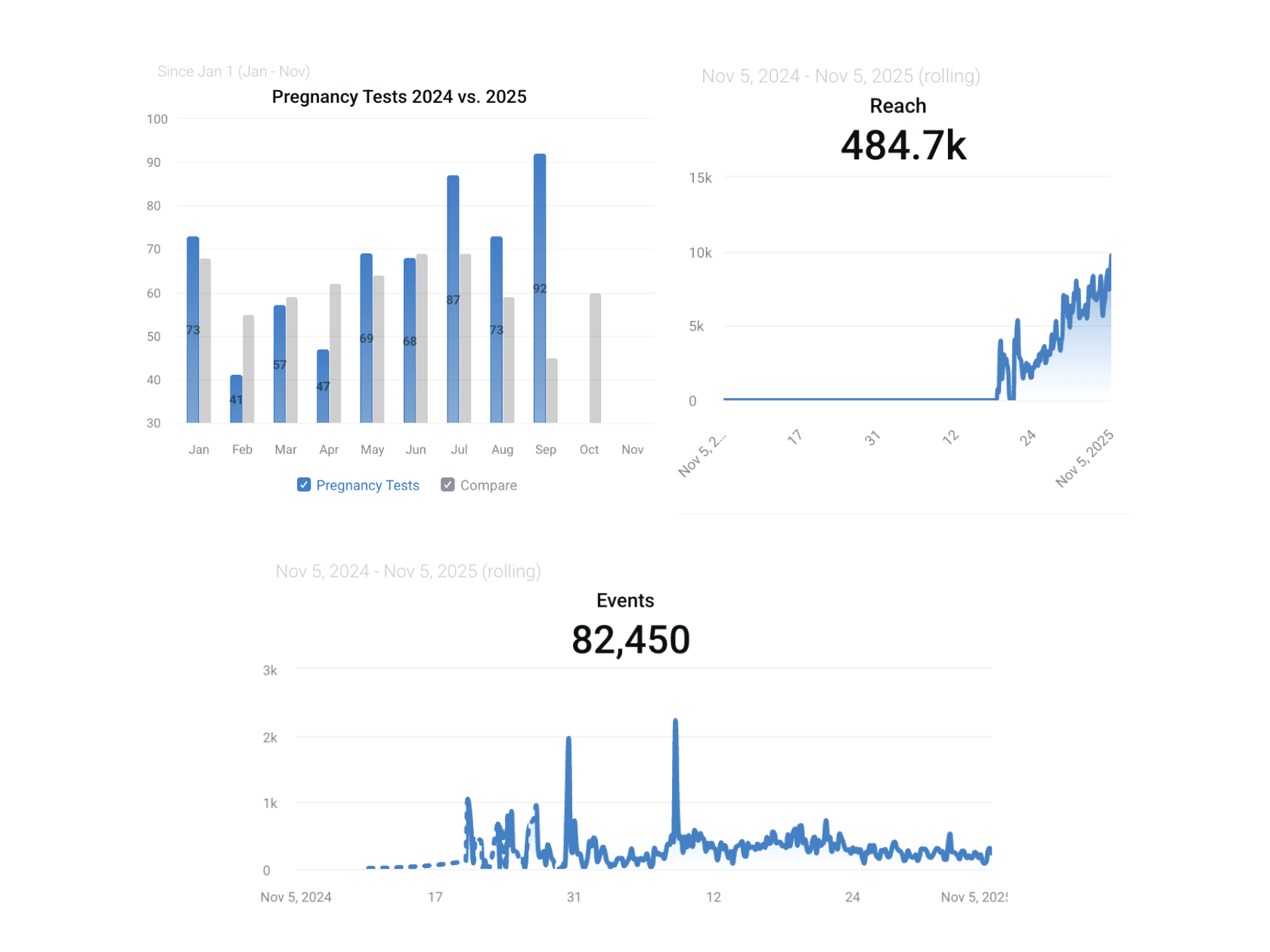 Here’s how the numbers connect to what matters most: more women reached, more compassionate care delivered and ultimately more babies in the world. Over the first 18 months, steady growth across web, email, paid media and Instagram widened awareness and shortened the path from “I need help” to “I’m getting care.” The KPI highlights below show the reach and engagement that are fueling that mission.