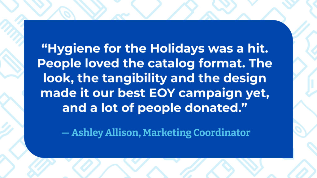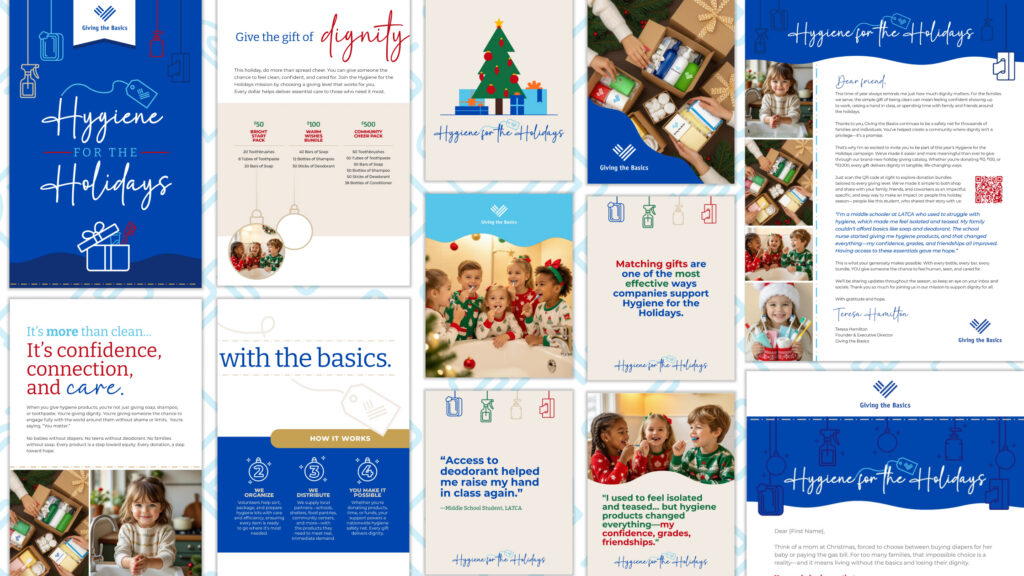 Giving the Basics’s year-end integrated campaign became a community favorite. The “catalog” format made the mission tangible and giftable, and the creative system extended across direct mail, email and social. Ashley calls it “the best EOY campaign we’ve ever done,” noting the design, clarity and donor response. It resonated because the storytelling and asks were tailored to each audience, the giving options were simple and tangible, and every touchpoint from mailer to landing page to follow-up felt cohesive. Indicators included 20% growth in total donations for 2025, rising from $880,000 to $1.055 million, along with stronger donor movement across the file through acquisition, upgrades and reactivation.